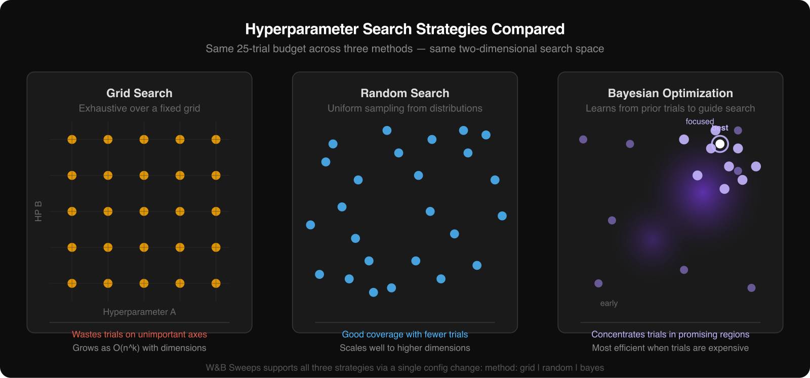 The right method depends on the cost of a run and the size of the search space. For a simple tutorial or a fast baseline model, random search is often enough. For expensive models, Bayesian methods become more attractive.