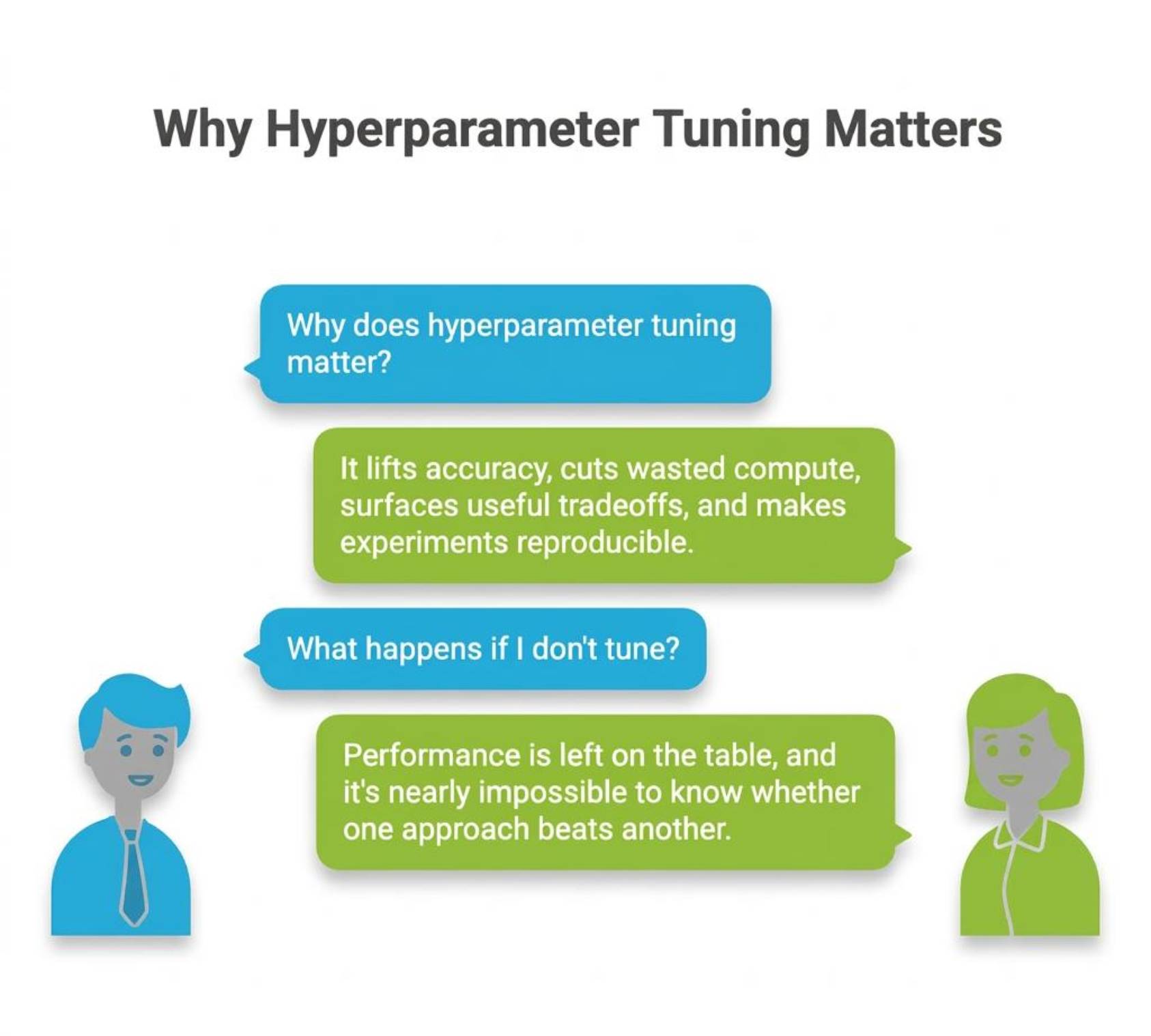 That is why tuning matters. It can improve model quality without collecting more data or changing the model architecture. It can also reduce wasted compute by ruling out settings that learn too slowly, overfit, or never converge to a useful region.