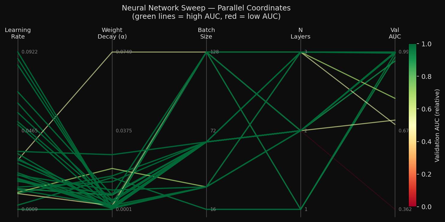 The neural network’s search space was also more interaction-heavy. It varied the learning rate, layer size, alpha, batch size, activation, and solver. Those choices do not act independently, which is why a neural network sweep often produces both excellent runs and very weak ones within the same budget.