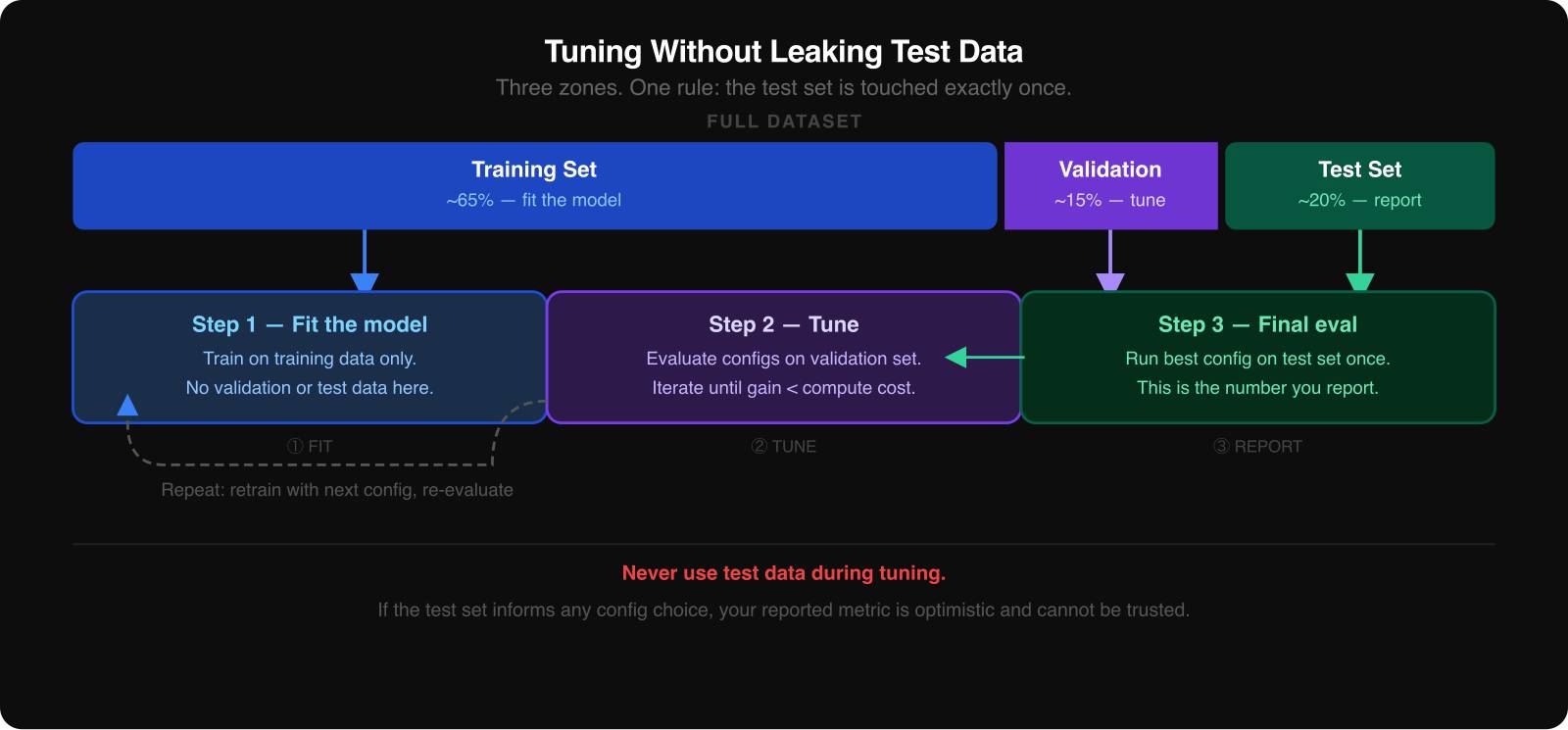 The safest way to think about the test set is as a sealed envelope. You open it once, after you have already chosen the winning configuration from the validation results.